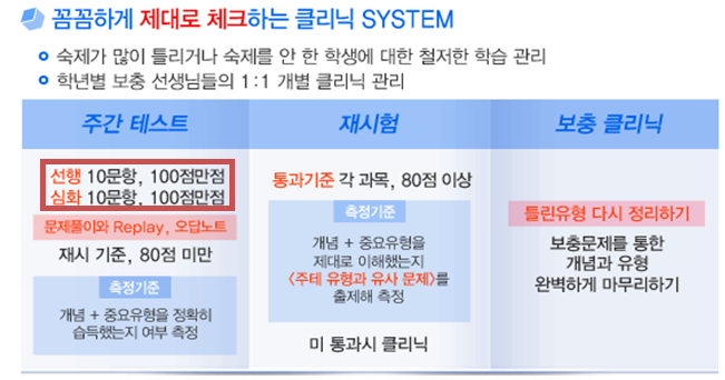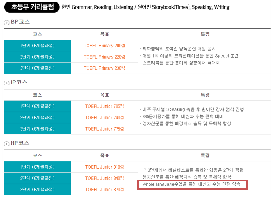 ▲ 영어 과목에서도 초등학생을 대상으로 “TOEFL 870점을 목표”로 하고, “수능 만점 약속”을 하는 수업을 광고하는 등 초선행 과정을 운영함.