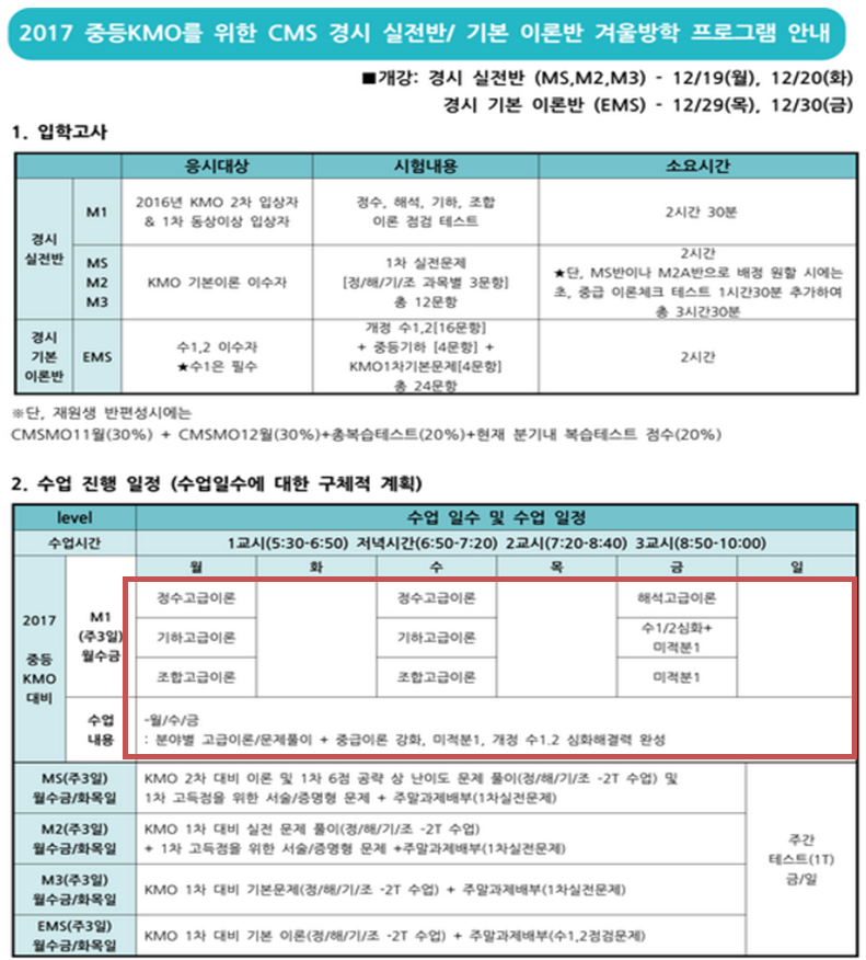 CMS(대치영재관)는 ‘2017 중등 KMO를 위한 CMS 경시 실전반/기본 이론반 겨울방학 프로그램’에서 최대 7년을 선행하는 수업을 진행하고 있었습니다(그림2). 이 수업에 참여할 수 있는 대상은 수 1, 2를 끝낸 학생입니다. 전화문의 결과, 이 수업에서 가장 어린 친구는 초등학교 4학년이라고 했습니다. 이는 이 초등학교 4학년 학생은 이미 고교 1학년 수학을 최소 1회 이상 공부하고, 고교 2학년 수학을 공부하고 있다는 뜻입니다. 무려 7년 선행입니다.