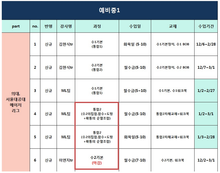 <그림3>은 미래탐구(대치) 학원의 예비 중1 즉, 현 초등학교 6학년 대상 수학 강좌입니다. 이 강좌는 의대, 서울대공대 등 손꼽히는 인기 대학 및 학과에 입학하고 싶은 학생들이 대상입니다. 초등학교 6학년에게 고등학교 2학년 ‘확률과 통계’ 과목의 순열조합까지 가르치고 있었습니다. 작년보다 1년 감소했으나 여전히 최대 선행 정도는 5년으로 확인되었습니다. 인기 대학 및 학과에 입학하고 싶은 학생들은 초등학생 때부터 고등학교 수학을 공부해야 함을 보여주고 있습니다.
