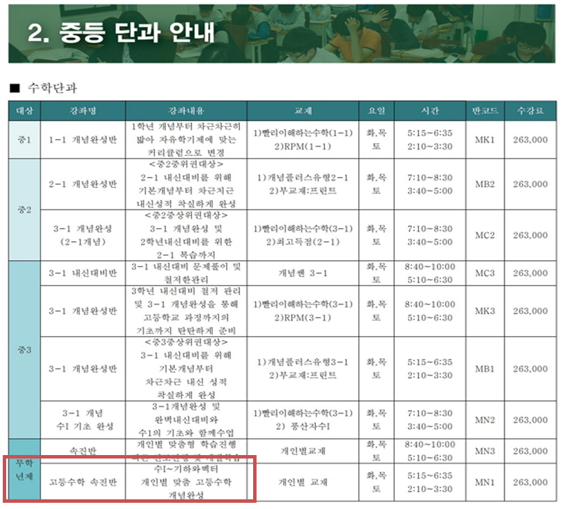이번부터 조사 대상에 포함된 종로학원하늘교육(목동)의 최고선행 상품은 수학 속진반입니다(그림4). 이 반은 중학생 무학년제로 중1부터 중3까지 수강할 수 있습니다. 고등학교 2학년 과정인 기하와 벡터까지 공부합니다. 이런 단과 수업 외에도 종합반인 중1 특목반은 중3의 수학과정을 공부하는 2년 선행 학습을 광고하는 등 학원의 대부분이 선행상품을 광고하고 있었습니다.