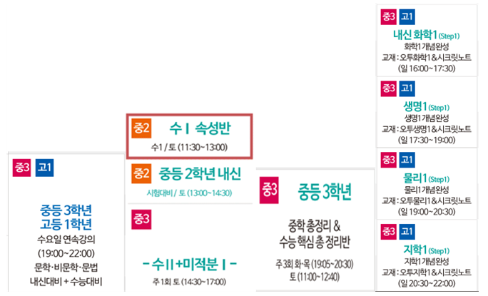 초등학교 4학년 학생이 고교 수학을 공부하는 것처럼 7년 선행은 극소수에 불과할 수 있습니다. 학원의 특별반에 들어가는 것도 특별한 목적이 있는 학생만 관심 두기 때문입니다. 그러나 청산학원의 단과 프로그램은 앞서 봤던 특별반과는 다릅니다(그림6). 이 속성반에 들어가기 위한 기준이 따로 있거나 특별한 목적을 위해 만들어진 반이라는 문구는 없습니다. 이 시간표를 접하는 수많은 학생은 중학교 2학년이 수 1을 배우는 것, 중학교 3학년이 수 2와 미적분을 배우는 것이 일반적인 현상이라는 것을 이미 알고 있습니다. 고등 과학은 수능 대비용이고 중학교 3학년부터 배우는 것이 당연하다고 생각하고 있습니다. 그런 생각을 하는 학생들이 학교의 정규 교과 수업에 만족할 수 없는 것은 어쩌면 당연한 결과일 것입니다.