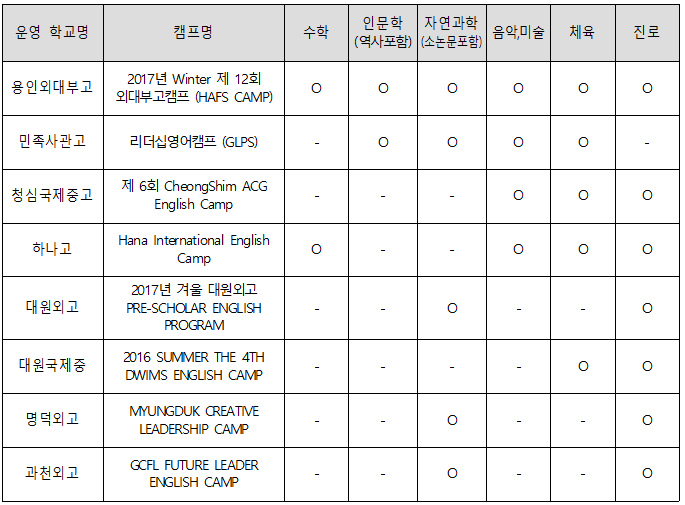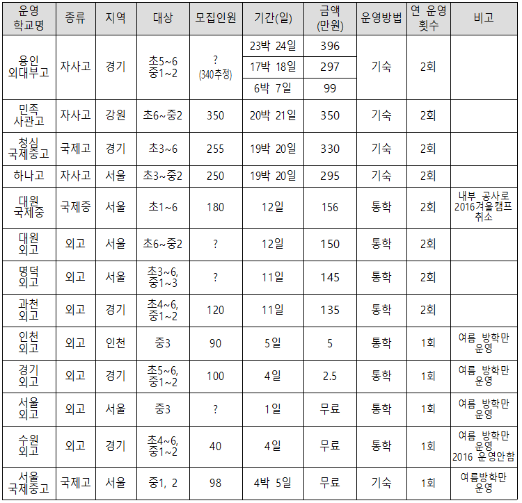 사교육걱정없는세상은 2015년에 특목고․자사고 중에서 영향력과 선호도가 큰 대원외고, 용인외대부고, 민족사관고, 하나고의 학교시설을 활용한 방학 중 어학캠프의 △프로그램 운영방식, △선행교육 유발요인, △캠프의 적법성 문제를 지적하였습니다. 그 후 캠프 운영 실태 변화를 알아보고자 이번 분석에는 2016년 여름방학부터 지금까지 개최된 어학캠프로 그 범위를 넓혀 국제중고 7개, 외고 31개, 자사고 21개 총 59개 학교의 캠프운영 실태를 조사하였습니다. 고액 캠프를 운영해온 용인외대부고(이하 외대부고), 민족사관고, 청심국제중고, 하나고, 대원외고, 대원국제중, 명덕외고, 과천외고 캠프는 집중 분석하였습니다. 세부 분석 결과 2015년에 지적했던 3가지 문제들은 그 정도의 차이가 있을 뿐 여전히 존재하고 있음을 확인하였고, 그 이외의 다른 문제들도 추가 발견되었습니다.