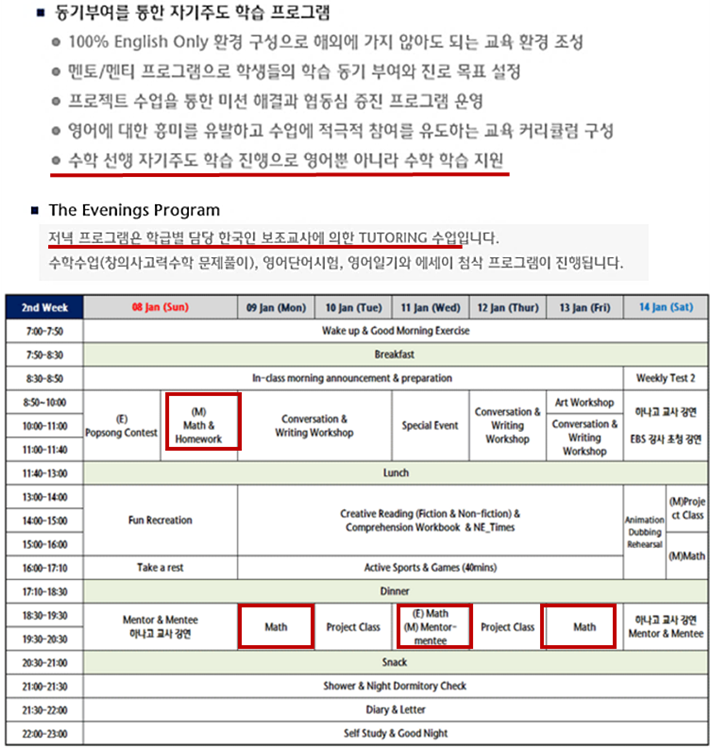 이뿐 아니라 캠프에서 수학 선행교육 과정을 운영하고 있었습니다(그림1). 하나고는 자기주도 학습으로 수학 선행 학습을 진행한다고 소개하고 있습니다. 영어캠프에서 수학까지 선행학습을 시키고 있는 이같은 상황은 명백한 선행교육 규제법 위반입니다. 이러한 영어캠프의 불법 사항은 국가와 지방자치단체가 시정해야 할 법적 책임이 있습니다(선행교육 규제법 제4조 2항). 따라서 교육부는 해당 고교의 불법 사항에 대해 법적 조치를 취해야 할 것입니다.