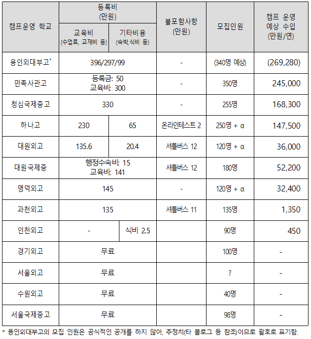 ■ 문제점 4: 1인당 참가비 350만원에 350명이 참가해 예상 매출액이 24억 5천만원인 캠프(민족사관고)에 대해 수입지출 현황 관련 정보 공개도 없고, 관리감독하는 기관도 없음. 또한 이런 거액의 캠프비용에 대해서 등록비 산정 기준을 전혀 공개하지 않아 ‘합리적 비용을 징수’하라는 교육부 기준 준수 여부를 일체 확인할 수 없음.