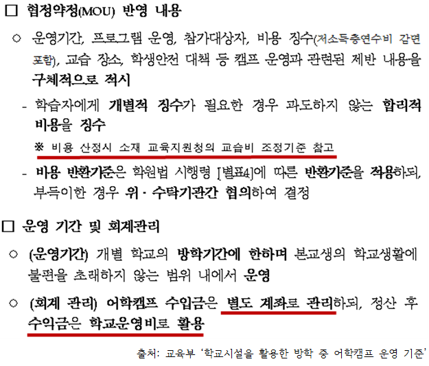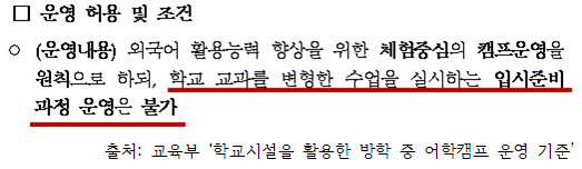 교육부에서 제시한 ‘학교시설을 활용한 방학 중 어학캠프 운영기준(이하 운영기준)’에 따르면 외국어 활용능력 향상을 위해서만 캠프를 운영해야 하며, 입시준비 과정 운영은 불가합니다.