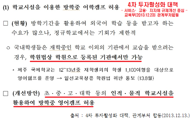 그러나 이 문제가 제기되자 2013년 12월 13일, 4차 투자활성화 대책을 통해 인적・물적 학교시설 활용한 방학 중 어학캠프를 위탁운영이라는 편법적인 방법으로 운영할 수 있도록 허용해버렸습니다. 학원법 상의 학원은 사인(私人)이 운영하는 경우에만 적용되기 때문에 캠프를 국가·지자체·교육청이 학교에 위탁을 해 운영하는 방식으로 학원법의 적용을 피해갈 수 있게 되었습니다. 게다가 교육부의 캠프 운영기준은 지침이기 때문에 운영 기준을 위반한다해도 아무 처벌도 받지 않습니다. 즉, 캠프 운영 학교는 지자체와 업무협약(MOU)를 맺고 마치 지자체가 위탁 운영하듯이 캠프를 진행하지만 실제로는 학교 마음대로 운영하며, 학원법을 비롯한 그 어떤 법의 규제도 받지 않는 것입니다.