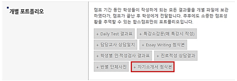 2015년에 문제점으로 지적했던 이 문제는 이번 조사에서도 확인되었습니다. 용인외대부고는 캠프 참가자들에게 자기소개서 첨삭본을 제공하고 있었습니다. 홈페이지의 캠프 소개란에는 캠프에 참여한 모든 학생들에게 자기소개서 첨삭본을 제공한다고 소개하고 있습니다. 이는 자사고 입학 시 학생이 제출하는 서류인 자기소개서를 작성하고 그것을 첨삭해서 제공하는 프로그램을 의미하는 것으로 명백한 상급학교 입시대비 과정입니다.