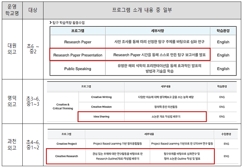 대원외고, 명덕외고, 과천외고 캠프에는 creative research, 탐구 학습역량 활동이란 이름으로 소논문 작성교육이 포함되어 있습니다(표2). 소논문은 최근 학생부종합전형과 관련해 고교생이 준비하기에도 부담이 크다는 평가를 받고 있는데 초등학생에게 이러한 교육을 실시한다는 것은 온당하지 못합니다. 또한 대입을 위한 프로그램을 해당 캠프를 통해 준비할 수 있다는 신호를 학생과 학부모에게 줄 수 있어 반드시 시정되어야 할 사항입니다.