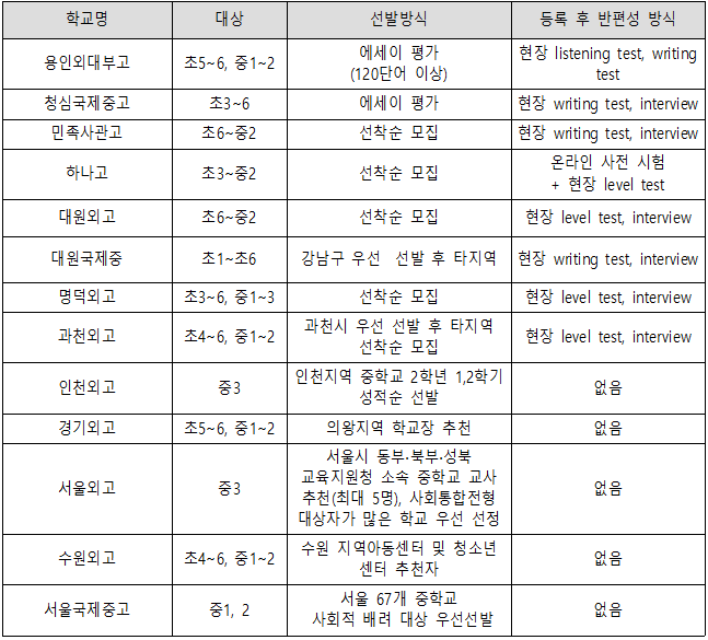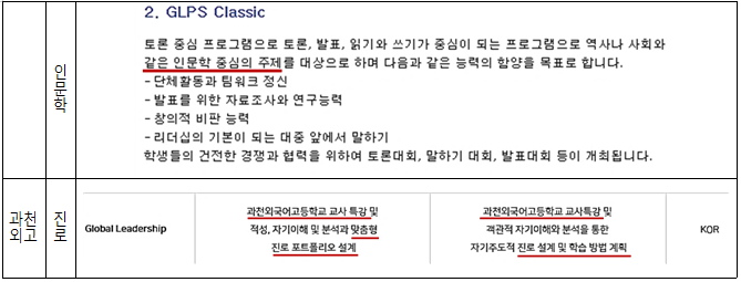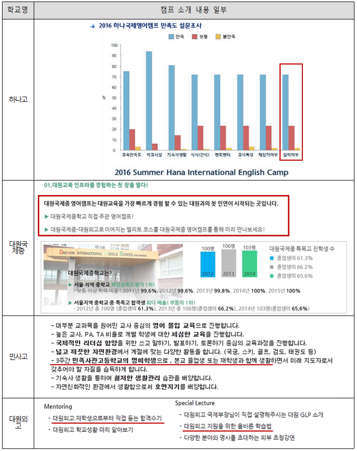 ■ 문제점 1: 하나고, 외대부고, 민족사관고, 대원국제중, 대원외고 등 5개 학교는 자소서 첨삭, 소논문 작성, 해당 학교 지원 위한 학습법 소개 등 영어 캠프를 통해 사실상 해당학교 입시대비 프로그램을 운영함. 이는 ‘입시준비 과정 운영은 불가’하다는 교육부의 운영 기준을 위반한 것임.
