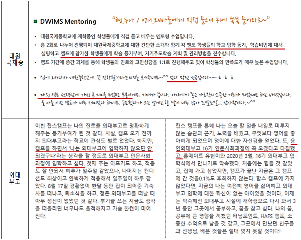 대원국제중이 홈페이지에 공개한 내용 중에는 ‘대원국제중-대원외고로 이어지는 엘리트코스를 대원국제중 영어캠프를 미리 만나보세요’라는 문구가 있습니다. 마치 이 캠프가 해당학교 입학을 위한 선수과정이라는 신호를 주는 표현으로 판단됩니다. 대원외고도 멘토링과 특강을 통해 ‘대원외고 합격수기’, ‘대원외고 학교생활’, ‘학교의 교육과정’, ‘대원외고 지원을 위한 학습법’과 같은 해당학교 진학을 위해 필요한 요소들을 참가자들에게 전달하고 있습니다.