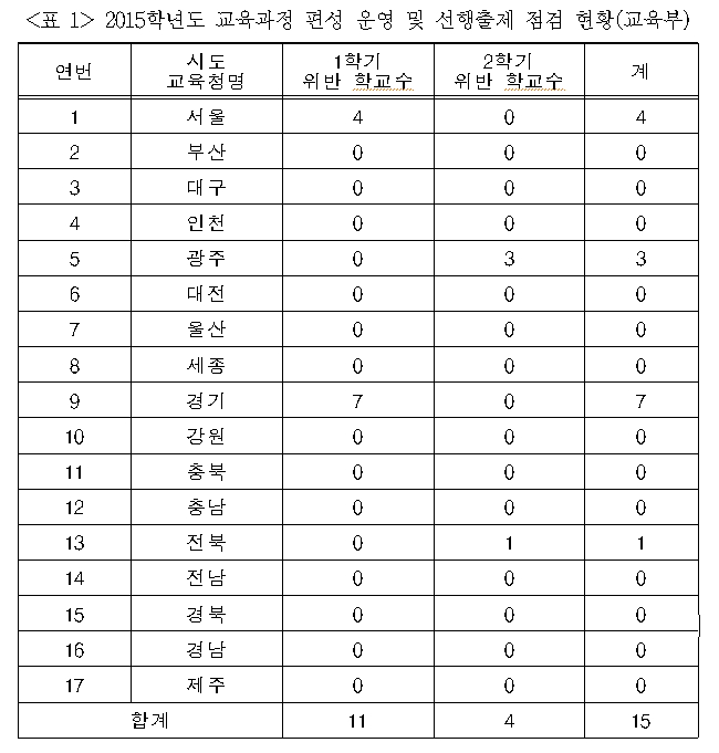 2014년 9월부터 선행교육규제법이 교육현장에 시행되면서 선행교육규제법 제8조에 의해 “학교는 국가교육과정 및 시·도교육과정에 따라 학교교육과정을 편성하여야 하며, 편성된 학교교육과정을 앞서는 교육과정을 운영하여서는 아니 된다.”와 같이 학교에서 적용하고 있습니다. 또한 선행교육규제법 제13조와 제14조에 따라 교육부장관 또는 교육감은 교육관련기관을 지도·감독하기 위해 자료 제출을 요구할 수 있고, 그 결과에 따라 시정 또는 변경명령을 내릴 수 있게 하였습니다. 이에 매년마다 각 시·도교육청은 관할 내의 모든 초·중·고등학교에서 출제한 시험지를 전수 조사하여 선행출제 여부를 점검하여 결과를 교육부에 제출하고 있습니다. 하지만 각 교육청이 자체 선행출제 점검을 실시하고 있지만 선행정도와 성취수준을 느슨하게 적용하는 등 제식구 감싸기에 급급하여 선행출제 결과를 축소한다는 의혹이 제기되고 있습니다. 다음은 각 시·도 교육청이 교육부에 보고한 2015학년도 교육과정 편성 운영 및 선행출제 점검 현황입니다.