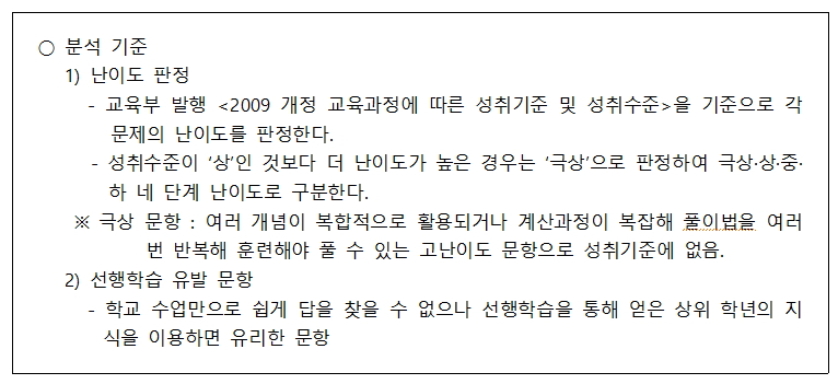 ▲ 학교 시험을 통해 사교육을 유발하지 않고, 과도한 선행학습으로 수학교육의 질 저하를 초래하지 않도록 학교에서는 수학과 교육과정의 성취기준 및 성취수준에 적합한 난이도의 문항을 고르게 출제하고, 선행유발 문항 출제를 철저히 배제해야 함.