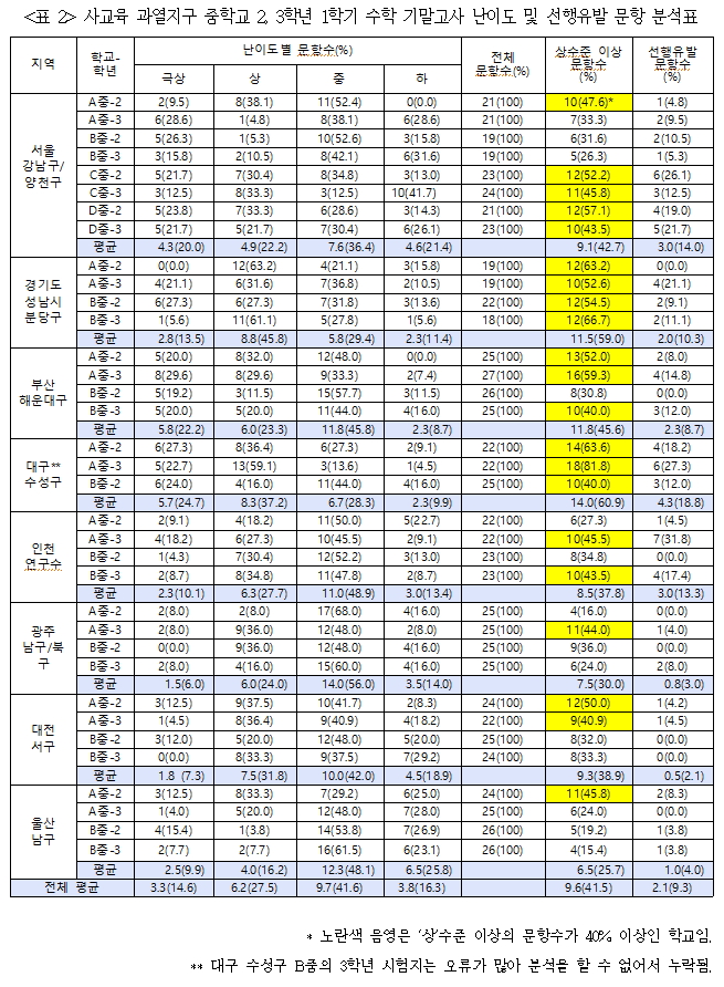 사교육 과열지구에 있는 18개 중학교 2, 3학년 1학기 수학 기말고사의 난이도를 조사한 결과, 여러 개념을 복합적으로 활용하거나 계산 과정이 복잡해 풀이법을 여러 번 반복 훈련해야 풀 수 있는 고난이도 문항으로 특정 성취기준에 없는 ‘극상’ 문제가 전체 35개 시험지 중 단 3개를 제외한 32개(91.4%)에서 출제되었습니다. 또한 선행유발 문항은 전체 35개 시험지 중 8개를 제외한 27개(77.1%)에서 출제되었습니다.