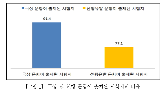 ▲ 조사 결과, 전체 35개 시험지 중에서 극상 문제가 32개(91.3%)에서 출제되었고, 선행유발 문항이 출제된 시험지는 27개(77.1%)로 나타남.