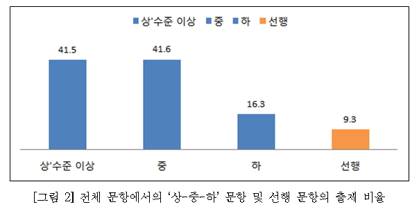 전체 문항수를 기준으로 볼 때, ‘상’수준 이상(난이도 상과 극상)의 문항 비율이 전체 41.5%, ‘중’수준의 문항 비율은 41.6%, ‘하’수준의 문항 비율은 16.3%로 나타났습니다. 한국교육과정평가원의 자료에 따르면, 난이도 분포를 적절하게 조절(예, 상 30%, 중 40%, 하 30%)할 것을 권유하고 있는데 ‘상’수준 이상의 문항 비율은 거기에 약 1.4배 정도 높고, ‘하’수준 문항 비율은 권장 기준치의 50% 밖에 되지 않습니다.