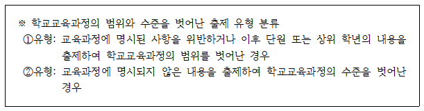 ▲ 학교 시험을 통해 사교육을 유발하지 않고, 과도한 선행학습으로 수학교육의 질 저하를 초래하지 않도록 학교에서는 수학과 교육과정의 성취기준 및 성취수준에 적합한 난이도의 문항을 고르게 출제하고, 선행유발 문항 출제를 철저히 배제해야 함.