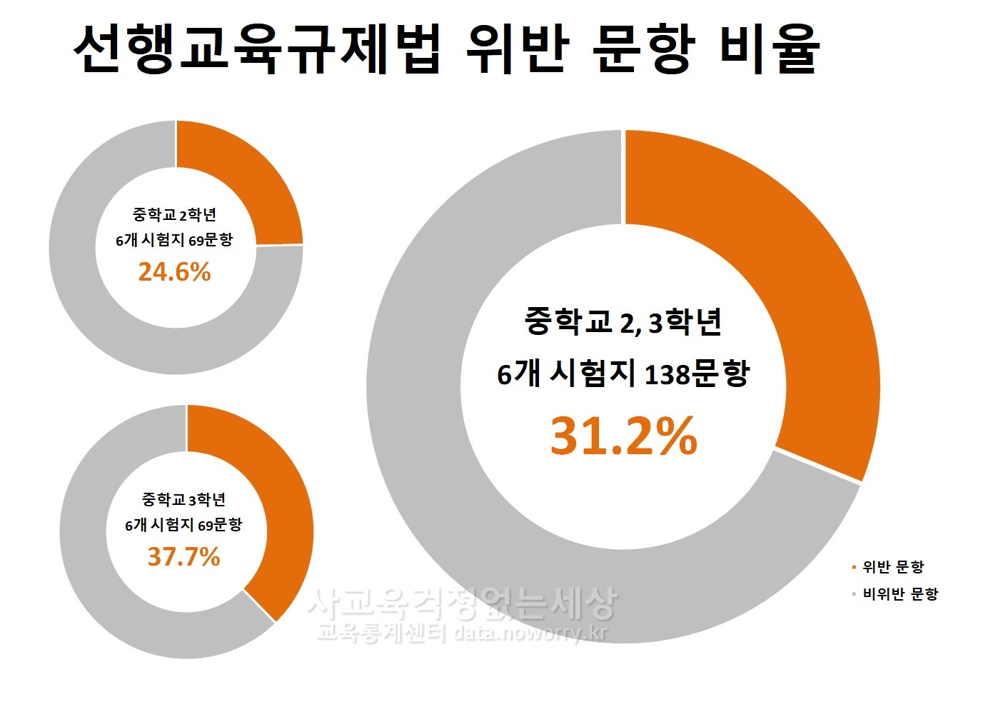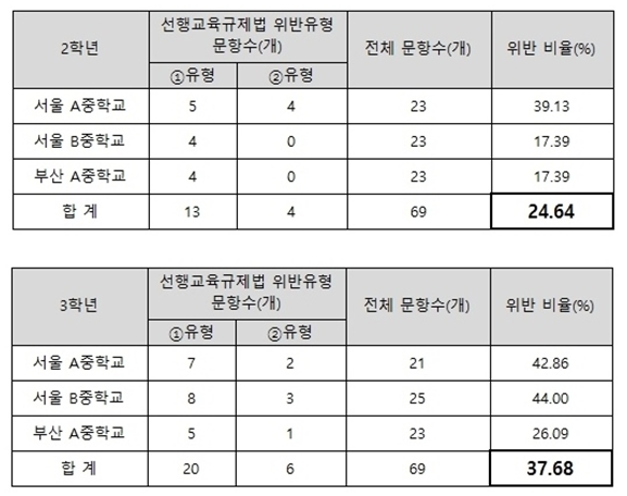 중학교 2학년의 경우 전체 69문항 중 선행교육규제법 위반 문항의 수가 17개로 24.64%로 나타났고, 중학교 3학년의 경우 전체 69문항 중 선행교육규제법 위반 문항의 수가 26개로 37.68%로 나타났습니다. 중 2, 3학년 모두를 합하면 138문항 중 43개(31.16%)나 선행교육규제법을 위반한 문항을 출제하여 법을 어기고 있습니다. 교육부는 이에 적법한 조치를 취해야 할 것입니다.