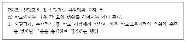 ▲ 교육부와 교육청은 형식적인 선행교육규제법 위반 여부를 제대로 점검하여 필요한 조치를 취하고, 선행출제가 일어나지 않도록 적극적으로 예방 조치해야 함.