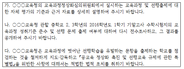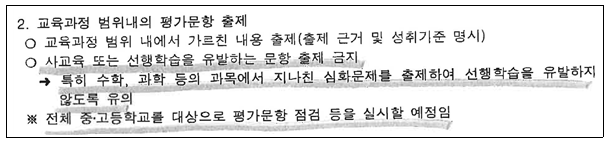 2. 교육부와 교육청은, 교육과정에 벗어난 선행학습을 유발하는 문항을 출제하는 학교를 점검하는 것을 철저하게 지도·감독하고 선행교육규제법을 위반한 사항에 대해서는 적법한 조치를 취하기 바랍니다.