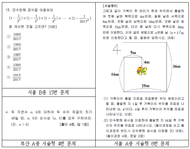 중학교 3학년의 경우 교육과정의 <교수·학습상의 유의점>에는 “인수분해는 이차방정식의 해를 구하는 데 필요한 정도로 다룬다.”고 되어 있습니다. 그런데 많은 시험 문제가 이차방정식과 무관한 아주 어려운 내용을 포함하거나 치환을 이용한 인수분해까지 다루고 있어서 교육과정의 수준과 범위를 벗어나고 있습니다.