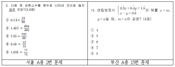 서울과 부산 사교육과열지구 3개 중학교 수학시험지 100% 선행교육규제법 위반