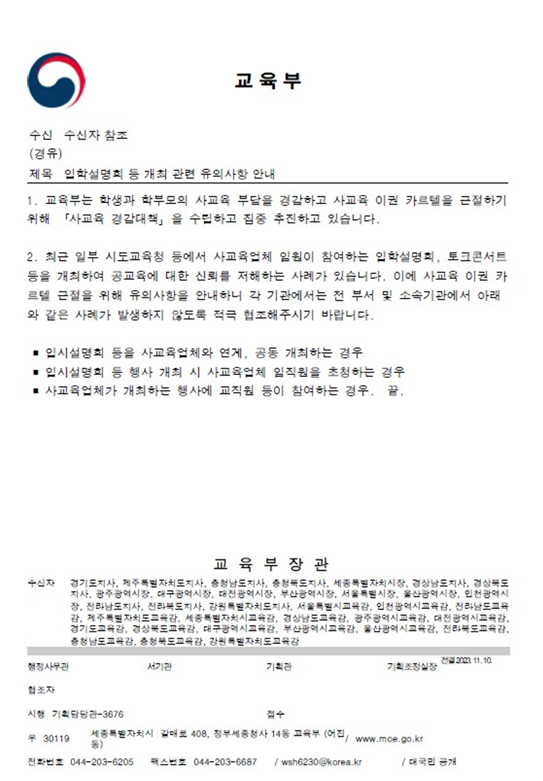 2023년 사교육걱정없는세상(이하 ‘사교육걱정’)이 '사교육 연사를 초빙 대입 설명회'에 대한 실태조사 결과를 발표하며(2023.08) 시정을 요구한 뒤, 교육부는 17개 시도교육청·광역자치단체에 △‘입시설명회 등을 사교육 업체와 연계, 공동개최하는 경우와 △사교육 업체 임직원을 초청하는 경우’가 발생하지 않도록 하는 취지의 공문을 발송했습니다(2023.11). 이는 교육부가 사교육걱정이 제기한 문제의 심각성, 공교육에 대한 신뢰 저하 및 사교육 의존도 심화 등의 부작용에 공감했기 때문에 이루어진 조치였습니다.