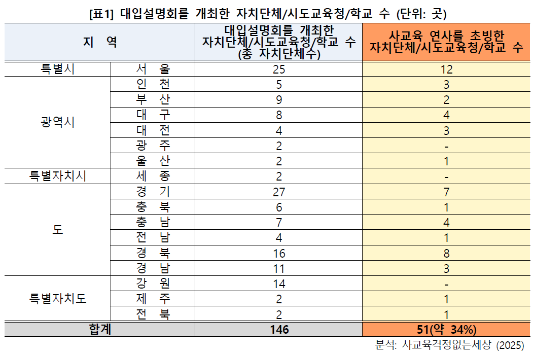 사교육 연사를 초빙하는 공공기관 입시 설명회, 올해 전국 51곳 발견돼... 교육 당국의 강력한 금지 조치를 촉구합니다!