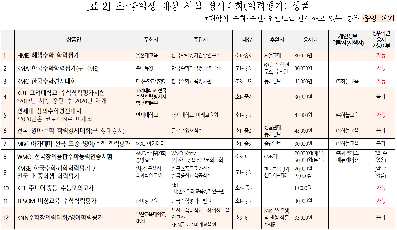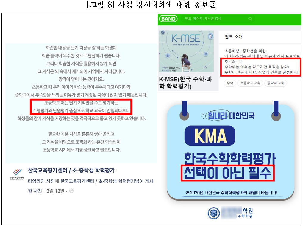 ▲ 사교육 기관은 일찍이 초등학교 때부터 전국 등수를 매기는 시험으로 엄혹한 입시경쟁 환경에 익숙해져야 한다며 경시대회를 홍보하고 있음. 이에 경시대회 수상실적이 학생부 기재 및 상급학교 입시에 활용할 수 없음에도, 사설 대회에 최대 수만 명까지 몰리고 있음. ▲ 사교육걱정없는세상은 사설 경시대회에 관여한 대학들에 뼈저린 각성을 촉구하며, 교육부에 △초‧중학생 경시대회에서의 전국등수 제공, 상위학년 응시행위, 과도하게 어려운 문항출제 금지, △영리 목적의 사설 경시대회의 응시처로 초중고 및 대학교 장소 대여 금지, △대학이 사설 경시대회에 일절 관여하지 못하도록 대책 마련, △단위학교 차원에서 학업성취 현황을 학부모와 적극 소통하도록 지원 등을 요구하는 바임. 사교육 시장에서는 초‧중학생들에게 전국 석차를 매기는 경시대회 상품이 판매되고 있습니다. 올해는 코로나 상황으로 일부 대회들이 내년으로 연기됐지만, 대부분은 오프라인 시험을 축소‧폐지하고 온라인 시험을 병행‧대체하는 방식으로 진행됐습니다. 그 중 응시생 규모가 가장 큰 HME 해법수학 학력평가는 상반기 응시생 규모가 작년 6만여 명에서 올해는 5분의 1 수준으로 급감한 것으로 보입니다. 이처럼 예년에 비해 올해 응시생이 확연히 줄어든 것은 오프라인에 비해 온라인 시험에 대한 신뢰도가 낮고 감염에 대한 우려 때문으로 보입니다. 그러나 지난 수 년간 경시대회 응시생 규모가 점진적으로 늘어왔던 추이를 감안할 때, 코로나 장기화로 교육격차에 대한 학부모 불안이 자칫 전국 단위로 성적을 서열화하는 경시대회 수요로 이어지지는 않을지 우려가 큽니다. 특히 초‧중학생 대상의 사설 경시대회 가운데에는 대학이 주최‧주관‧후원을 통해 직‧간접적으로 관여하는 경우가 적지 않습니다. 이러한 대회들은 △‘고려대 수학학력평가시험’, ‘연세대 창의수학경진대회’처럼 대회 이름에 대학 브랜드를 직접 내걸고 대회를 주최‧주관하거나, △‘KNN수학창의력대회/영어학력평가’처럼 대학이 드러나지는 않지만 대학(부산교대)이 대회를 주최‧주관하거나, △‘HME해법수학학력평가(서울교대)’, ‘전국 영어‧수학 학력경시대회(성균관대)’처럼 대학이 후원하는 방식 등으로 분류됩니다. 그런데 사설 경시대회에 대학이 주최‧주관 및 후원으로 관여하는 것은 △일제고사 방식의 성적 서열화로 불안감 확산 및 학교교육 정상화를 저해하고, △선행학습을 유발하고 사교육비 부담을 가중시키며, △상업적 경시대회가 마치 공신력있는 대회로 오인될 우려가 있어 문제가 됩니다. ■ 문제점 ①: 고등교육 기관으로서 공적 책무를 가진 대학이 학생을 서열화하는 경시대회에 관여하는 것은 학생‧학부모들의 불안감을 확산시키고, 학교교육 정상화를 저해함. 초등학교에서 중간‧기말고사가 폐지되고, 중학교에 성취평가제가 도입되면서 초‧중학교 현장은 성적이라는 획일적 잣대로 학생을 서열화하고 사교육을 부추기는 일제고사 시행을 최소화하는 기조를 유지하고 있습니다. 이는 초‧중등 교육 현장에서 일제고사가 지역/학교/학생 간 등수 경쟁이나 시험대비식 교육과정 운영, 과열 경쟁 및 사교육을 부추기는 등 학교교육의 파행을 초래하는 폐단을 막기 위함입니다. 그런데 대학이 공적 책무를 몰각한 채 학생을 서열화하는 경시대회에 직‧간접적으로 관여하는 것은 학교교육 정상화를 역행하는 모순적 행보가 아닐 수 없습니다. 특히나 경시대회에 관여하고 있는 대학들은 국립대이거나 유명 사립대로 선호도가 높은 학교들입니다. 따라서 학생‧학부모 입장에게 초‧중학교에서 시행되는 과정/성장중심평가만으로는 충분치 않고, 사설 시험을 응시해야 할 것만 같은 불안감을 주기 쉽습니다. ■ 문제점 ②: 일부 경시대회는 과도하게 어려운 난이도로 문항을 출제할 뿐 아니라, 응시생의 실제 학년보다 높은 학년으로도 시험을 볼 수 있도록 상급학년 응시를 허용하고 있어 선행학습을 유발하며, 경시대회 응시료뿐 아니라 경시대비반‧대비교재 등 파생 상품으로 가계의 사교육비 부담을 가중시키고 있음. 사설 경시대회에서 출제되는 문항 중에는 정상적인 학교교육과정을 통해 대비할 수 없을 정도로 고난이도인 경우가 있습니다. 서울교대가 후원하고 있는 ‘HME 해법수학 학력평가’의 경우 올해 시행된 초등학교 3학년 문항 중 정답률이 0.0%이었던 25번 문항은 해당 학년 응시자(2,068명) 가운데 단 3명만이 정답을 맞출 정도로 극악한 난이도였습니다. 또한 ‘전국 초‧중학생 학력평가’는 초등학교 시기부터 대입 수준과 동일한 난이도‧유형의 문항을 출제함을 홍보하고 있습니다. 또한 HME해법수학학력평가, KMA한국수학학력평가, KMC한국수학경시대회, 연세대창의수학경진대회, KET주니어중등수능모의고사, TESOM비상교육수학학력평가 등 많은 경시대회들이 응시생의 실제 학년보다 높은 상위 학년을 선택하여 응시할 수 있도록 하고 있고, 이러한 사실을 앞세워 광고하고 있습니다. 학교에서 배울 수 없는 상위 학년의 학습 내용을 평가하는 시험을 응시하도록 자유롭