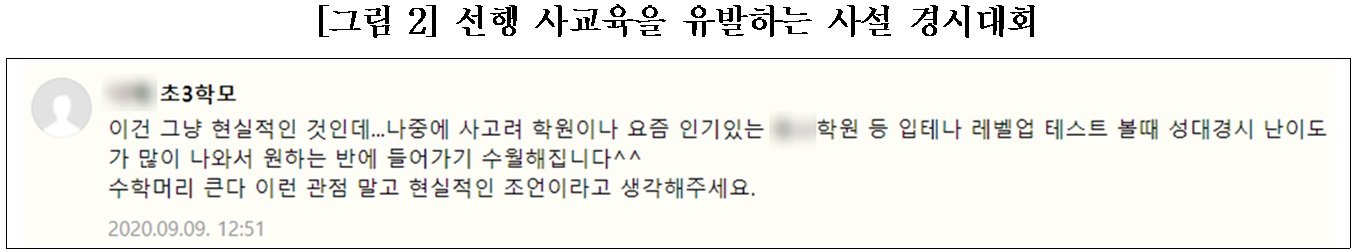 ▲ 코로나發 원격수업 장기화로 교육격차에 대한 학부모 우려가 큰 가운데 사교육 시장에서는 초‧중학생들에게 전국 석차를 매기는 경시대회 상품을 판매하고 있음. ▲ 그런데 일부 대학들이 이러한 사설 경시대회를 주최‧주관 또는 후원하며 관여하고 있음. ◎ 대회 이름에 대학 브랜드를 내걸고 대회를 주최‧주관: 고려대 수학학력평가시험, 연세대 창의수학경진대회 ◎ 대회 이름에 대학이 드러나지는 않지만 대회를 주최‧주관: KNN수학창의력대회/영어학력평가;부산교대 ◎ 대학이 대회를 후원: HME해법수학학력평가;서울교대, 전국 영어‧수학 학력경시대회;성균관대 ▲ 사설 경시대회에 대학이 직‧간접적으로 관여하는 것은 다음과 같은 문제점이 있음. ◎ [문제점 ①] 초‧중학교는 성적 중심의 획일적 서열화와 사교육을 부추기는 일제고사를 지양하고 있음. 그런데 고등교육 기관으로서 공적 책무를 가진 대학이 학생을 서열화하는 경시대회에 관여하는 것은 학생‧학부모들의 불안감을 확산시키고, 학교교육 정상화를 저해함. ◎ [문제점 ②] 일부 경시대회는 과도하게 어려운 난이도로 문항을 출제할 뿐 아니라, 응시생의 실제 학년보다 높은 학년으로도 시험을 볼 수 있도록 상급학년 응시를 허용하고 있어 선행학습을 유발하며, 경시대회 응시료뿐 아니라 경시대비반‧대비교재 등 파생 상품으로 가계의 사교육비 부담을 가중시키고 있음. ◎ [문제점 ③] 경시대회 이름에 유명 대학이나 언론사를 전면으로 내세우고 있지만, 응시생의 개인정보를 사교육 기관에 위탁하는 등 실질적 대회 운영의 주체가 사교육 기관인 경우가 있어 상업적 경시대회가 학생‧학부모에게 마치 공신력있는 대회로 오인되고 있음.