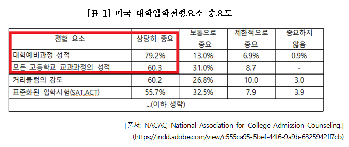 미국의 고교 교육과정은 학생들이 다양한 교과를 선택하여 각자의 흥미와 적성, 진도에 따라 시간표를 짤 수 있도록 하는 것이 가장 중요한 특징이었고, 고교 교육과정에서 이수한 과목의 수준과 구성 그리고 성적을 토대로 대학에서의 성공적인 학업 수행에 필요한 지식과 기능을 습득하였는지, 즉 내신을 대입전형에서 가장 중요하게 반영하고 있습니다. [표1]과 같이 미국대학입학카운셀링협회 2015년 보고서에 의하면, 미국 대학의 경우 대입전형에서 대학 예비과정의 성적, 고교 교과과정의 성적, 커리큘럼의 강도 등 내신요소가 차지하는 중요가 비중이 가장 높게 나타났습니다. 우리의 수능에 해당하는 SAT나 ACT의 중요도는 내신 다음에 있었습니다.  미국의 대학입시는 우리의 수능과 같은 표준화된 시험(SAT/ACT) 성적 위주로 학생을 선발하기보다는 고교 교육과정에서 이수한 과목의 수준과 종류 등이 입학 사정에서 오히려 큰 영향력을 미치고 있었습니다. 고교 교육과정에서 학생들의 자율적인 과목 선택의 폭이 크고 대학과목 선이수제나 대학 예비코스 등 대학에서의 전공과목과 다양한 교과목의 경험 및 선이수 등이 가능하기 때문이겠지만, 입시에서만 다양성을 이야기하기보다 고교 교육과 대학 교육 자체의 전반적인 특성에서 다양성을 바탕으로 미국 대학의 입학 사정이 이루어지고 있는 점은 고교 학점제 도입을 논의하는 시점에 우리에게도 시사점을 주었습니다. 또한 대부분의 미국 고교에서는 절대평가 방식을 취하고 있습니다. 물론 크고 작은 시험이 계속 있고, 과제물, 퀴즈, 에세이까지 다 점수에 포함되고 있지만, 같은 과목이라 하더라도 교사에 따라 수업 내용과 시험 문제와 난이도가 다른 경우가 대부분입니다. 우리의 수능에 해당하는 국가 표준화 시험인 SAT나 ACT 또한 고교 커리큘럼을 충실히 수행한 학생들이라면 추가적인 학업 부담 없이 표준화 시험을 잘 치를 수 있도록 하여, 고교 교육을 정상화하고 사교육 부담 경감을 위해 개혁해 나가겠다는 것이 최근의 흐름입니다.