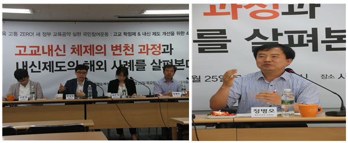 정병오 정책위원은 고교 내신 절대평가와 관련해서 우리가 나아가야 할 방향은 분명하다고 했습니다. 내신과 수능에서 절대평가를 도입하고 고교 내신 기록을 풍성히 하고 대학이 그 기록을 읽어내야 하는 방향은 분명하지만, 대학서열화가 여전히 존재하고 상위권 대학에 집중된 현재 상황에서 과연 어떻게 도입할 것인가에 대해서는, 내신보다는 수능을 먼저 절대평가하고 당분간 내신은 어느 정도 변별을 주는 방법을 제안했습니다. 둘 다 함께 절대평가를 도입할 때 대학 측의 반발이나 제도 도입에 따른 유불리에 따른 다양한 반응들을 고려한다면, 당장은 수능 절대평가 안착에 집중하고, 내신은 상대평가 체제에서 지금보다 조금 더 유연하게 조정하자는 것입니다. 1등급의 비율을 조금 더 넓게 조절하거나 수강인원에 따라 1등급의 비율을 달리하거나 해서 상대평가의 틀은 유지하더라도 다양한 선택과목의 개설이 가능하도록 해서, 예상되는 문제로 인해 필요한 정책이 멈추어 서게 하지 말고, 문제가 적으면서도 앞으로 나갈 방법을 모색할 것을 주장했습니다.