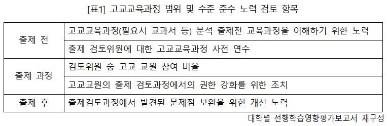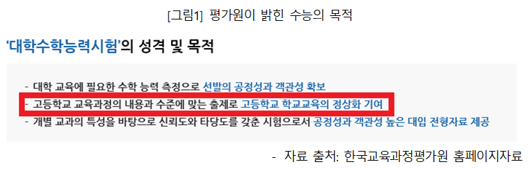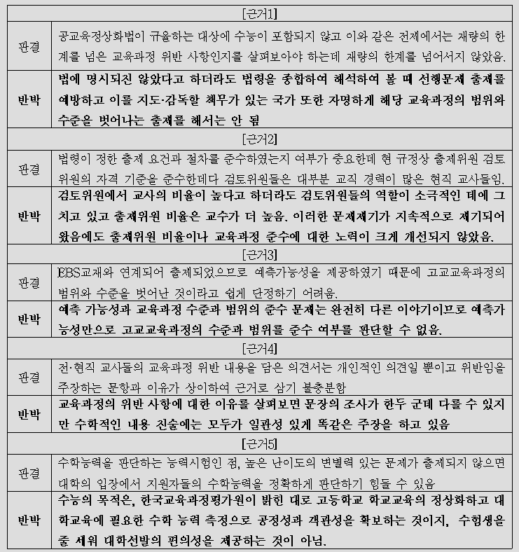대학수학능력시험의 세계지리 문항 오류를 인정한 서울고법판결에 따르면 (2014. 10. 16., 선고, 2014누40724) , “학생들로 하여금 진리를 탐구하도록 하는 교육의 목적과 고등학교 교육과정의 정상적인 이수에 의한 대학수학능력의 존부를 측정하는 수능시험의 특성”을 고려하여야 한다고 하였습니다. 즉 수능시험은 학생들로 하여금 진리를 탐구하도록 하는 교육의 목적과 고등학교 교육과정의 정상적인 이수에 의한 대학수학능력의 존부를 측정하는 것이라고 밝히고 있습니다. 대학수학능력시험은 상급학교 진학을 목적으로 하고 있는 고교교육과정을 정상적으로 이수하였는지를 중심으로 대학수학능력의 존부를 평가하는 시험이어야 합니다. 변별을 위하여 교육과정 이상의 높은 난이도를 출제할 수 없습니다.그렇기 때문에 수학능력시험에 한국교육과정평가원도 고등학교 교육과정의 내용과 수준에 맞는 출제를 하겠다고 밝히고 있는 것입니다.