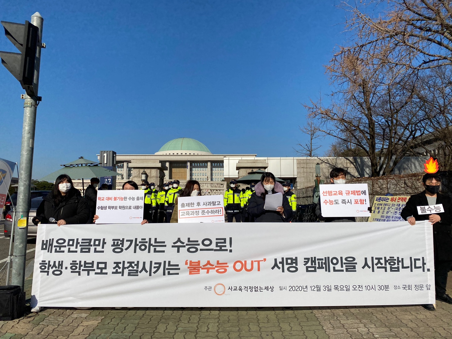 수능 직전 다시 찾아온 코로나19 웨이브에도 사교육걱정이 국회 앞에 나와 피켓을 들고 구호를 외치는 이유는 깨어 있는 시민 여러분께 동참해 주실 것을 호소하기 위해서입니다. 불수능으로 인해 수험생과 학부모가 더 이상 신음하지 않도록 하기 위해 정부와 국회에 법개정을 촉구하는 일에 뜻을 모아 주십시오. 사교육걱정은 시민들께서 이 일에 동참하실 수 있도록 홈페이지에 ‘불수능 OUT 10만 시민 서명운동’ 페이지를 열었습니다. 또한 불수능에 대한 시민들의 의견을 모으는 ZOOM 간담회 등 다양한 온라인 캠페인을 전개할 뿐만 아니라 코로나19 확산세가 진정되면 다양한 방식으로 함께 하기를 원하는 시민들과 연대하는 일을 도모할 계획입니다.