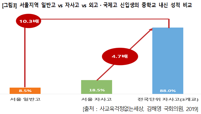 ▲【전국단위 자사고】특히 전국단위 자사고는 전국의 중학교 성적 우수자들을 독점하고 있고, 이렇게 최상위권 학생들을 선발한 효과는 소위 SKY대학 입학 실적으로 나타나 전국단위 자사고를 고교서열의 정점으로 군림하게 하고 있음