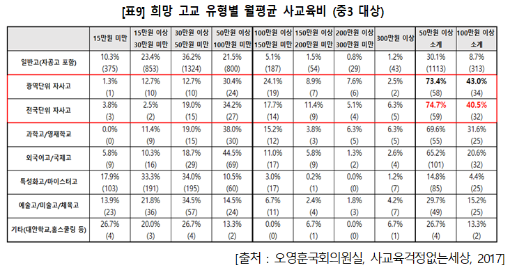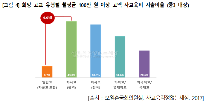 서열화 된 고교체제는 고입 단계의 과도한 사교육 고통은 물론 사교육비 격차로 인한 교육 불평등을 유발하는 등 그 폐해가 심각한 수준입니다. 이는 2017년 사교육걱정이 전국 중학교 3학년 학생 7,382명을 대상으로 실시한 희망고교 유형별 중학생들의 월평균 사교육비를 보아도 확인할 수 있습니다. [표9]와 [그림4]에서 보듯이 월평균 100만 원 이상의 고액 사교육비 지출 비율은 일반고를 희망하는 중3 학생의 경우 8.7%지만, △광역단위 자사고는 43.0%, △전국단위 자사고의 경우 40.5%,로 최대 약 4.9배의 차이를 보이고 있습니다.