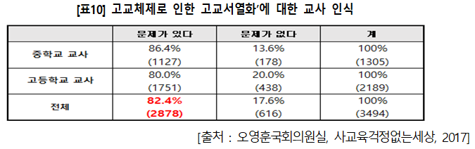 학교 현장에 대해 누구보다 가장 정확하게 체감하고 있을 현장 교사들의 응답도 그 의미가 작지 않습니다. 설문에 응답한 중3과 고1을 담당하는 전국 3,494명의 교사들 중 무려 82.4%인 2,878명의 교사가 고교서열화를 심각한 문제로 인식하고 있었습니다.