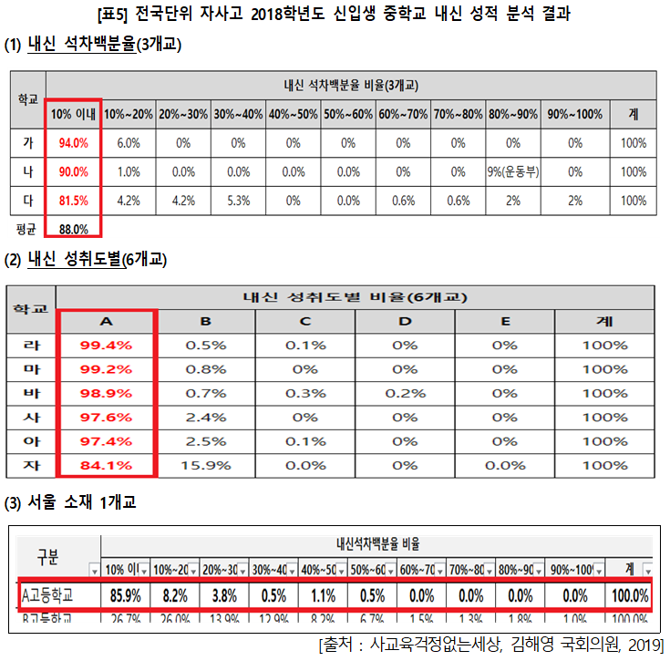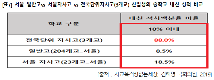 【내신 석차백분율로 분석】 전국단위 자사고 3개교 신입생의 중학교 내신 성적 상위 10% 이상 비율은 최대 94.0%, 평균 88.0%로 서울 일반고 평균 8.5%에 비해 약 10.3배 높은 것으로 확인됨. 【내신 성취도별로 분석】 전국단위 자사고 6개교 신입생의 중학교 내신의 경우, 제출한 모든 과목의 성취도를 합산한 결과 A등급에 해당하는 학생 비율이 최대 99.4% 에 달하는 것으로 확인됨. 이는 신입생 대부분이 중학교 성적 최상위권 학생임을 의미함.