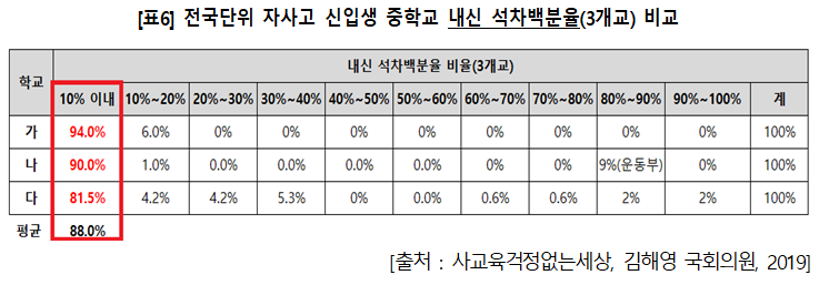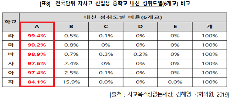 내신 성취도별로 분석한 전국단위 자사고 6개교의 경우, 신입생의 과목별 성취도를 모두 합산한 결과 A등급의 비율이 무려 최대 99.4%인 것으로 분석되었습니다. 이 결과 또한 전국단위 자사고가 중학교 성적 최상위권 학생들을 싹쓸이 하고 있음을 의미합니다.