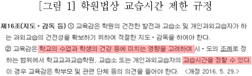 학교교과교습학원은 학원법 제16조 2항에 따라 시도별 조례가 정하는 범위 안에서 심야영업에 대한 시간제한(22시∼24시)을 두고 있습니다. 이는 심야 사교육 영업이 △과도한 경쟁교육 환경과 사회적 낭비를 조장하고 △학교교육 정상화를 방해하며 △청소년의 육체·정서적 발달을 저해하고 건강과 안전을 위협할 수 있다는 폐해를 고려한 것입니다.
