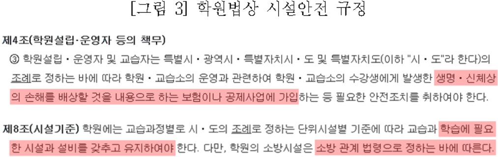 ■ 문제점➁ [시설/인력] 스터디카페는 학원법상 시설 및 환경 안전기준(지하층 운영 금지, 소방시설 완비, 유해업소와의 거리, 배상보험 가입 등), 성범죄 경력자취업제한 규정을 적용받지 않아 범죄, 화재 등으로부터 청소년 보호 장치가 취약함.