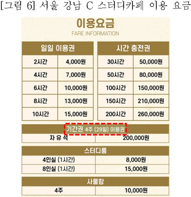 ■ 문제점➂ [교습비] 스터디카페는 최대 29일 이용권까지만 판매하며 학원법 규제를 피하고 있는데, 이용도중 환불 시 법규정이 별도로 없어 소비자 피해가 우려됨.