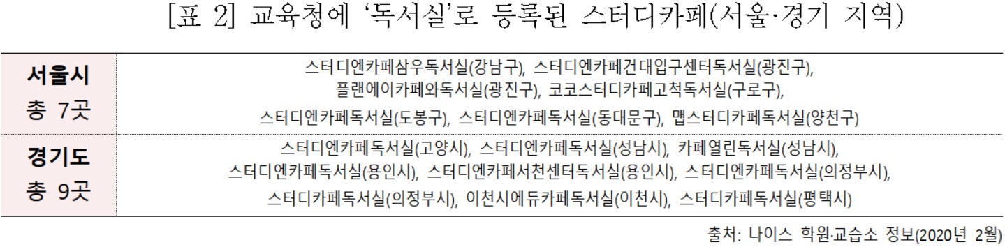 전국에 70여개의 가맹점, 5만여 명의 회원을 가진 한 유명 스터디카페는 가맹점 홍보에서 독서실과는 달리 관련 법규상의 제약을 받지 않는 점을 주된 내용으로 강조하고 있습니다. 이처럼 스터디카페가 학원법의 사각지대이며 독서실에 비해 쉽게 창업할 수 있다는 점이 마케팅에 활용되고 있는 실정입니다. 이에 따라 스터디카페 창업은 지속 확산세이며, 기존의 독서실 사업장들도 스터디카페로 전향하고 있는 추세입니다. 따라서 스터디카페를 이용하는 청소년들의 불법/심야 교습, 화재, 성폭력 등 안전문제, 이용요금 반환문제 등에 대한 교육 당국의 대책 마련이 시급한 상황입니다.
