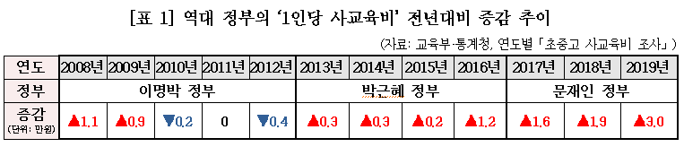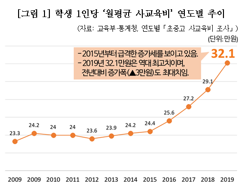 1인당 월평균 사교육비 32.1만원으로 전년대비 3만원 폭증은 사교육 경감대책에 미온적이었던 문재인 정부가 초래한 2차 참사입니다. |
