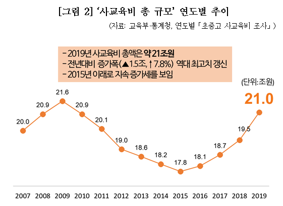 사교육비 총 규모도 21조원으로 사교육비 총액이 최고치였던 2009년(21.6조원)에 육박하였으며, 연도별 증가폭은 전년대비 1조 5천억원(+7.8%) 증가하여 역대 최고치를 갱신하였습니다. 사교육 참여율 역시 74.8%로 전년대비 1.9%p 상승하였으며, 학교급별 사교육 참여율도 초중고교생 공히 증가하였습니다. 또한 과목별 사교육비, 사교육 참여시간도 증가하여 사교육비 조사 항목 중 어느 것도 감소한 것이 없이 작년에 이어 사교육비 폭증 사태가 더욱 악화되었음이 통계수치상 확인되었습니다. |