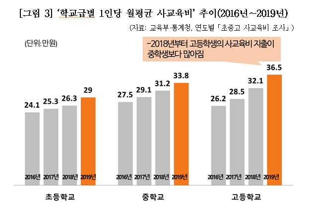 오늘 발표된 재난 수준의 사교육비 폭증 결과는 △정시 확대기조와 수시 부담을 유지하는 현 정부의 대입제도, △2017학년도부터 유지되는 불수능 기조, △고교체제 개선에 대한 정부의 늑장대응 등 명확한 사교육 유발요인을 안고 있는 교육정책에서 기인한 것입니다. 사교육걱정은 1인당 월평균 사교육비가 전년대비 1.9만원이 올라 역대급 사교육비 폭증이었던 ‘2018 초중고 사교육비 조사’ 결과 발표 직후에도 기자회견을 통해 사교육 유발요인을 억제할 수 있는 적극적인 경감 대책을 내놓지 않으면 내년에도 사교육비는 폭증할 것이라고 예고한 바 있습니다. 그러나 정부는 이렇다 할 대책을 내놓지 않다가 연말이 되어서야 2025년까지 자사고・외고・국제고를 일반고로 전환하겠다는 대책과 학생부 종합전형에서 사교육 유발요인이 큰 요소인 수상경력・자율동아리・자기소개서를 폐지하겠다는 방안을 발표했습니다. 그러나 이러한 방안도 정책 추진의 절차와 법 제도의 제약으로 인해 3년이나 5년 뒤에 시행되는 상황에서 추가적인 보완대책과 약속한 정책 추진의 신뢰를 국민 앞에 보여주지 못한다면 사교육비 폭증을 가라앉히는 것은 매우 어려운 일이 될 것입니다. 그런데 이런 심각한 상황에도 교육부의 추가적인 보완대책이 보이지 않는다는 것입니다. 가장 핵심적인 사교육 유발 요인인 대학입시 부담 및 경쟁을 완화하기 위한 대책이 보이지 않는 것은 매우 안타까운 현실입니다. 그나마 4월까지 지역의 교육 환경과 사교육 특성 등을 고려한 사교육 경감 대책을 수립하고 추진하겠다는 의지를 표명한 것은 다행스러운 일입니다. 다음으로 이번 사교육비 조사 결과의 주요 특징 및 분석 내용을 말씀드리겠습니다. ■ 특징①: 학교급별 1인당 월평균 사교육비는 고등학생(36.5만원)이 가장 많고, 뒤이어 중학생(33.8만원), 초등학생(29.0만원)순으로 2018년부터 고등학생 사교육비 지출이 중학생보다 많아짐. 학교급별 1인당 월평균 사교육비는 고등학생(36.5만원), 중학생(33.8만원), 초등학생(29.0만원)순으로 고등학교에서 사교육비 지출이 가장 많은 것으로 나타났습니다. 2017년까지는 중학생 수치가 고등학생보다 높았으나, 2018년부터는 고등학생의 사교육비 지출이 중학생보다 많아졌습니다. |
