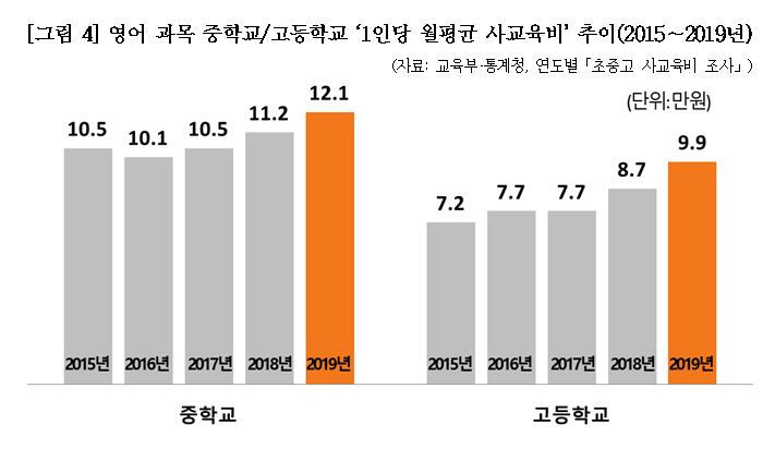 학교급별 1인당 월평균 사교육비는 초·중·고 모든 학교급에서 증가했을 뿐만 아니라, 각 학교급별 증가폭도 작년보다 크게 늘어났습니다. 2018년 사교육비 조사에서 학교급별 1인당 월평균 사교육비 증가폭은 초등학생 1.0만원(↑3.7%), 중학생 2.1만원(↑7.1%), 고등학생 3.6만원(↑12.8%)이었으나, 이번 2019년 조사결과 초등학생 2.7만원(↑10.3%), 중학생 2.6만원(↑8.4%) 고등학생 4.4만원(↑13.6%)으로 나타났습니다. 특히 고등학생의 경우 초중고 학교급 가운데 단연 많은 사교육비를 지출하고 있고, 작년에 이어 사교육비 증가폭도 가장 두드러졌습니다. 이는 2018년부터 고등학생에게 직결되는 대입 제도 및 환경에서 사교육 유발 요인이 지속 증가되고 있음을 의미합니다. ■ 특징③: 과목별 1인당 월평균 사교육비는 영어(9.4만원)가 가장 높고, 수학(9.0만원), 국어(2.3만원), 사회·과학(1.3만원)순이며, 전년대비 증가폭도 영어는 9천원(↑10.8%)으로 작년에 이어 가장 많이 증가한 과목임. 과목별 1인당 월평균 사교육비의 경우 일반 교과목은 영어(9.4만원), 수학(9.0만원), 국어(2.3만원), 사회·과학(1.3만원)순으로, 영어 사교육비가 가장 높았습니다. 이는 전년 대비 영어 9천원(↑10.8%), 수학 7천원(↑8.8%), 국어 2천원(↑11%), 사회·과학 1천원(↑12.4%) 오른 수치로, 작년에 이어 영어가 전년대비 사교육비 증가 액수도 가장 많은 과목이었습니다. 이는 2018학년도부터 도입된 수능영어 절대평가 정책이 영어 사교육비 절감이라는 취지를 실현하고 있지 못함을 의미합니다. |