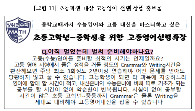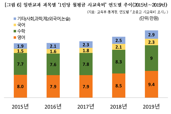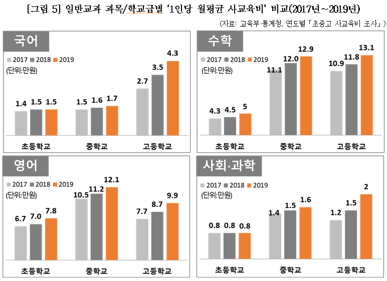 학교급 가운데 특히 고등학교 사교육비의 폭증 현상이 지속적으로 발견되는데, 고등학교 과목별 1인당 월평균 사교육비는 수학 13.1만원, 영어 9.9만원, 국어 4.3만원, 사회·과학 2.0만원이었습니다. 이는 전년 대비 수학은 1.3만원, 영어는 1.2만원, 국어는 0.8만원, 사회·과학은 0.5만원 오른 수치로 고등학교 모든 과목에서 사교육비 증가세가 뚜렷하게 나타난 것을 확인할 수 있었습니다. |