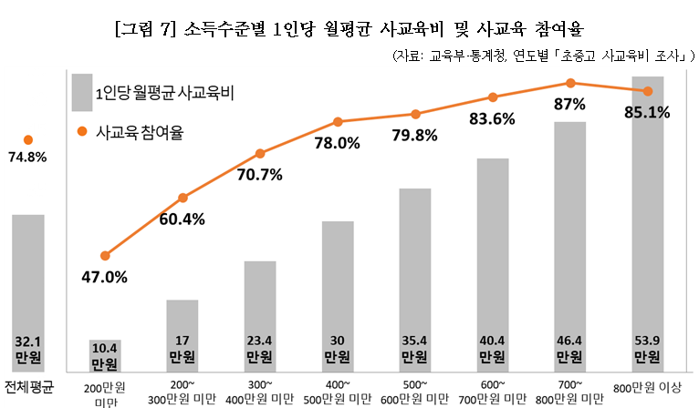 ■ 특징④: 소득구간별 1인당 월평균 사교육비는 최소소득과 최대소득 구간 사이에 5.0배 차이로 교육 양극화 현상이 명확히 확인됨.