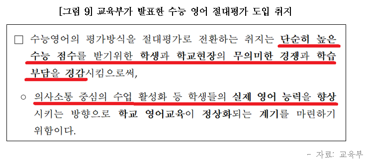 여기에 국어․수학․사탐․과탐이 상대평가인 상황이 중학생을 수능 영어 사교육으로 유도하고 있는 상황입니다. 절대평가 되었지만 난이도가 어려운 수능 영어를 미리 대비하라는 신호는 물론이고 상대평가 과목이 더욱 중요해졌기 때문에 절대평가인 영어는 중학교 때 끝내고 고등학교에서는 상대평가 과목을 준비하라는 신호를 사교육 시장에서 주는 것입니다. 이 신호는 중학교로 끝나지 않고 초등학생 수능 대비 영어 사교육으로 이어지는 현실입니다. |