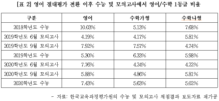 하지만 평가원이 실시한 2019학년도 수능 모의고사부터 난이도를 급격하게 올려 1등급 학생이 4.19%가 나오게 되자 ‘영어 절대평가는 어렵다.’는 도식이 성립됩니다. 한국교육과정평가원이 제공하는 2019학년도 수능 채점자료를 보면 실제로 영어 1등급 비율이 5.30%로 수학 1등급 비율(수학 가형 6.33%, 수학 나형 5.98%) 보다 낮습니다. 절대평가가 되어 90점 이상이면 1등급이 됨에도 불구하고 비율이 낮게 나타난 것은 그만큼 영어가 어려웠다는 증거입니다. 이런 기조가 이어진다면 당연히 영어 사교육 수요는 더욱 늘어나게 되는 것입니다. 여기에 평가원이 실시하는 6월 모의고사, 9월 모의고사, 실제 수능에서 1등급 비율이 5%대와 7%대를 오가는 상황이 연출되면서 수험생 입장에서 수능 영어의 난이도를 종잡을 수 없는 상황이 연출되는 것입니다. 즉 절대평가된 수능 영어는 어렵거나 난도를 종잡을 수 없으니 방심하면 안 된다는 신호를 수험생들에게 주는 것입니다. |